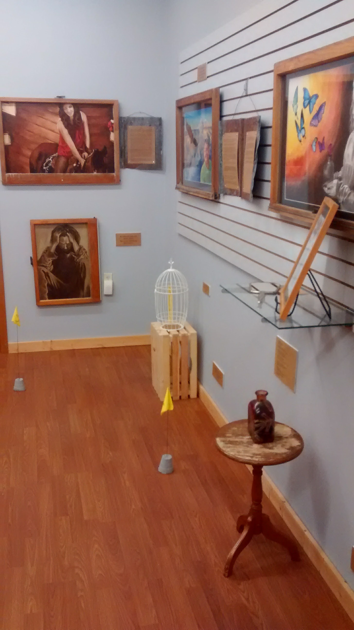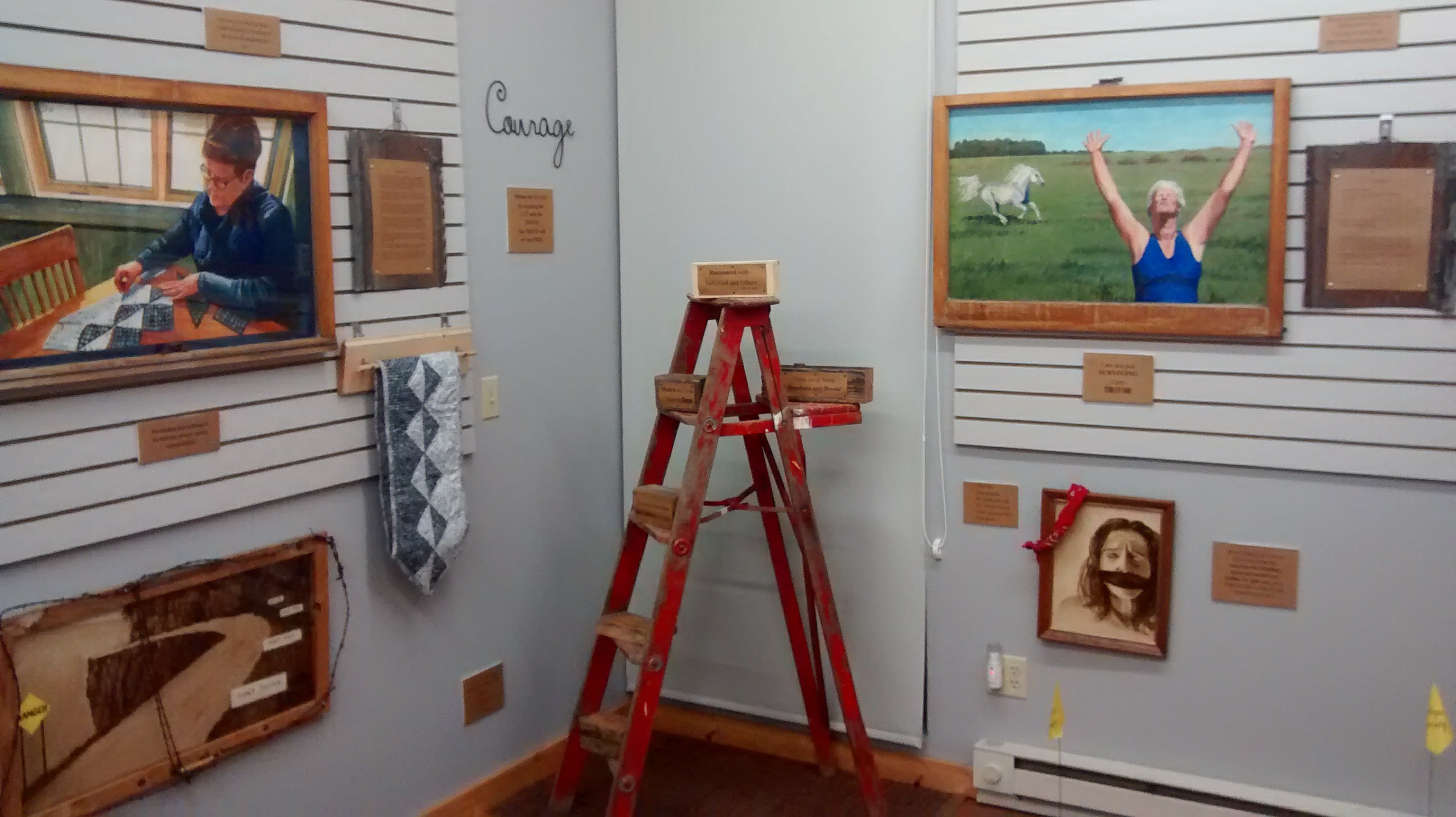 I uesd a variety of windows to display the portrait stories. Windows are a symbol of the access to our souls. Discarded materials were found and repurposed throughout the display to represent the lives of survivors feeling discarded, but finding healing and their new purpose in life. Warning signs of abusers are posted on small yellow flags through out the exhibit as well as steps toward freedom.